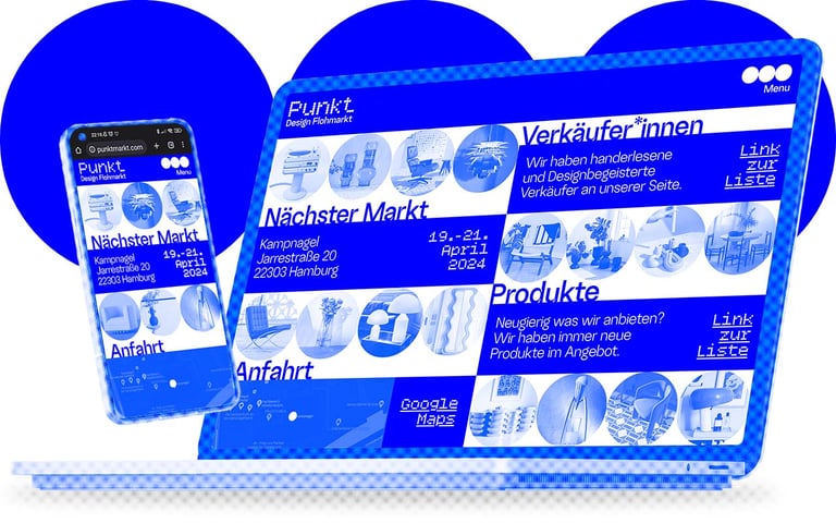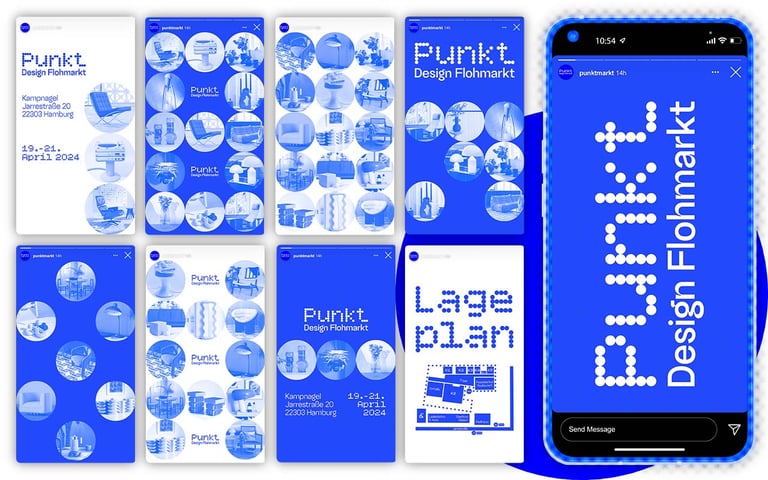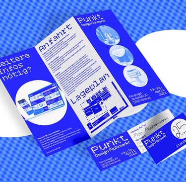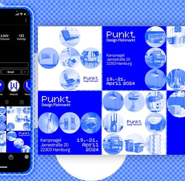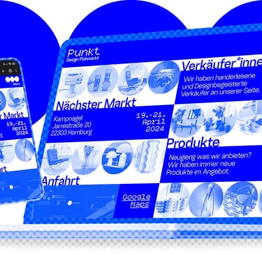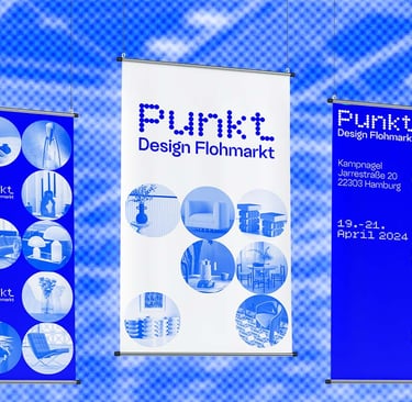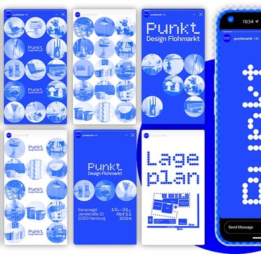 Punkt. is a corporate design for a design flea market. Conceptually, everything revolves around the basic shape of the circle. All design elements, as well as the logo, follow this principle. Inspired by Yves Klein, the primary color is a radiant blue that captures the brand identity in a simple and elegant way.