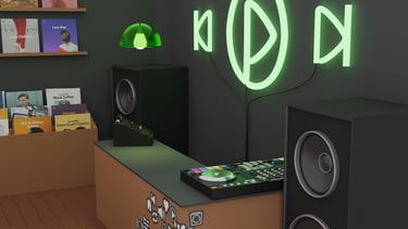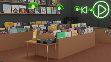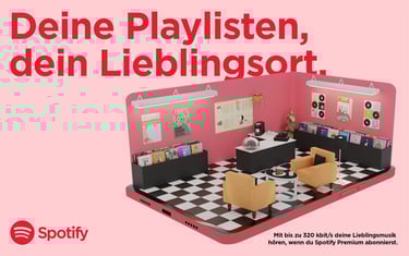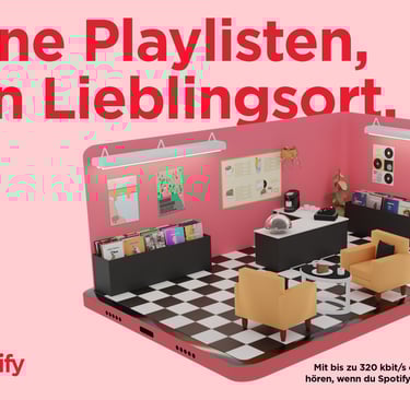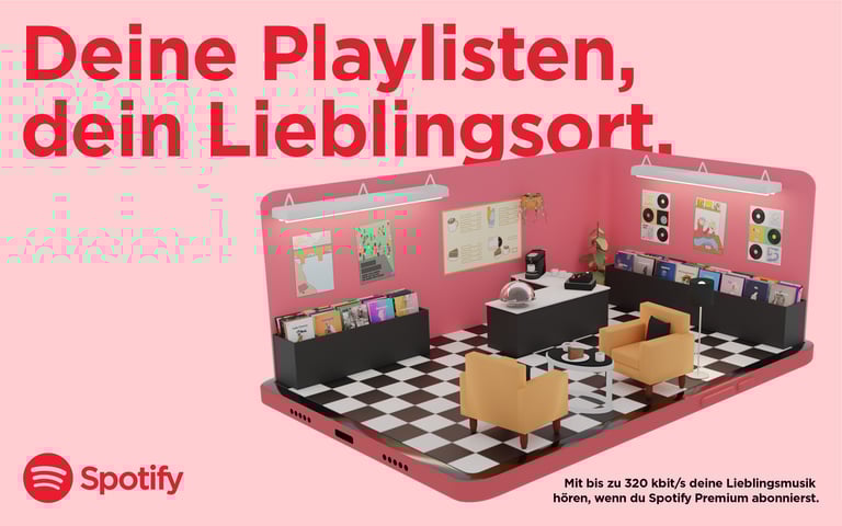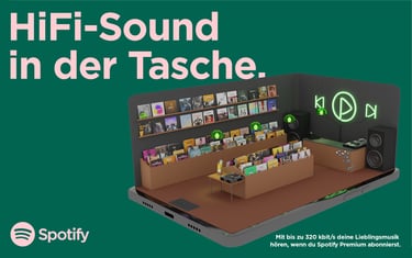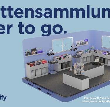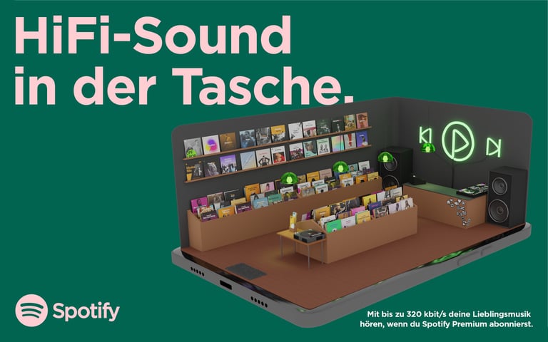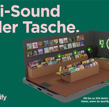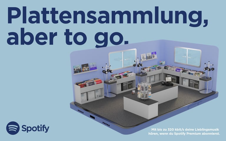 To showcase Spotify’s 320 kbit/s sound quality, a full record store emerges from a smartphone, turning digital audio into a tangible experience.
